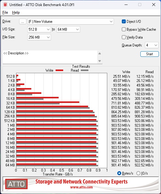 Скорость работы с сжимаемыми данными оценивает бенчмарк ATTO Disk Benchmark. В нем накопитель показал высокие показатели – до 923 МБ/с при чтении и до 908 МБ/с при записи. Это почти вдвое превышает возможности SSD с классическим интерфейсом SATA.