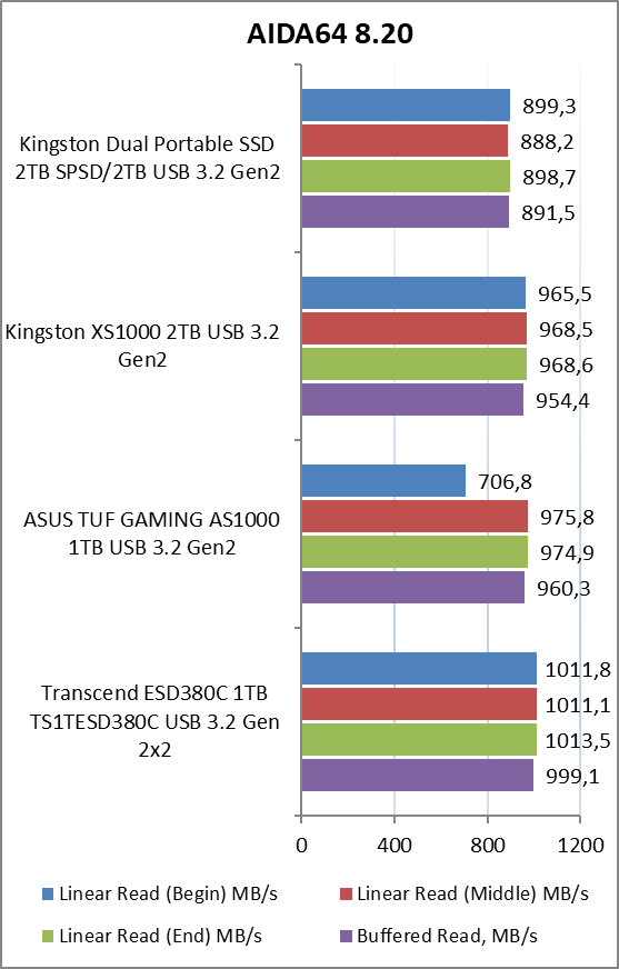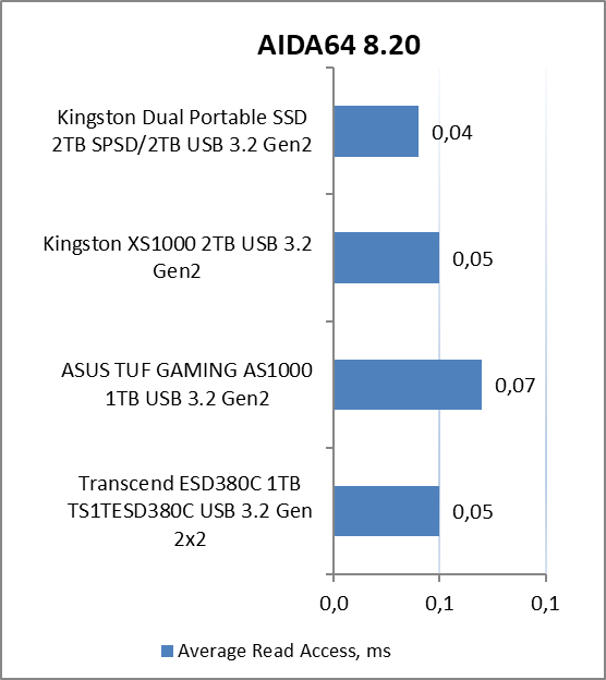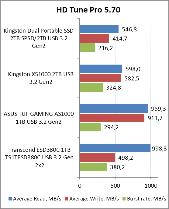 Если сравнивать скорость Kingston Dual Portable SSD (SPSD/2TB) с не столь компактным XS1000, то тестируемая новинка немного отстает. Однако разница не принципиальная, и в реальных сценариях ее практически не будет ощутимо. Отставание от некоторых конкурентов от других производителей заметнее, но и стоят они значительно дороже.