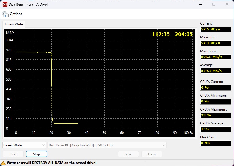 Непрерывная линейная запись первых 20% пространства (около 400 ГБ) происходила при максимальных почти 900 МБ/с. Дальше заканчивается SLC-кэш, и скорость падает до 57 МБ/с – а вот это уже уровень медленных 2,5-дюймовых жестких дисков. Для сравнения, у Kingston XS1000 этот показатель был втрое выше – 170 МБ/с.