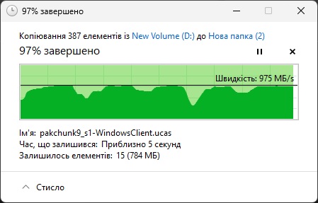 Копирование архива объемом 17,7 ГБ происходило со скоростью чтения около 975 МБ/с с редкими просадками, а запись до 727 МБ/с.