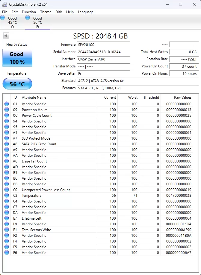 Во время тестов твердотельник нагревался максимум до 56°С, что на 4°С ниже заявленной рабочей температуры. При этом корпус прогрелся до 40°С.