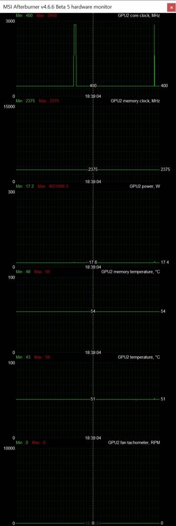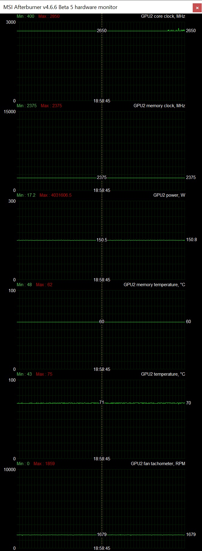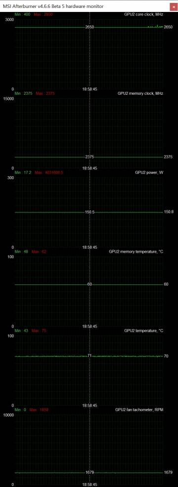 В режиме автоматической регулировки скорости вентиляторов под максимальной нагрузкой мы зафиксировали температуру GPU на уровне 70°C, при этом его бустовая частота составляла 2650 МГц. Видеопамять прогревалась до 60°C. Оба вентилятора системы охлаждения работали на 51% от максимума (до 1700 об/мин), обеспечивая комфортный шумовой фон среднего уровня.