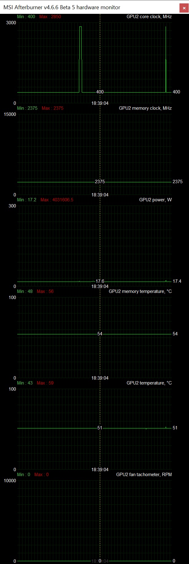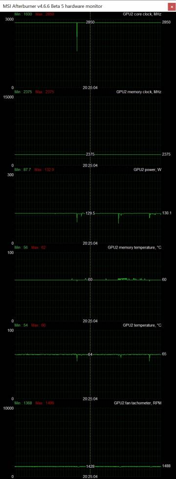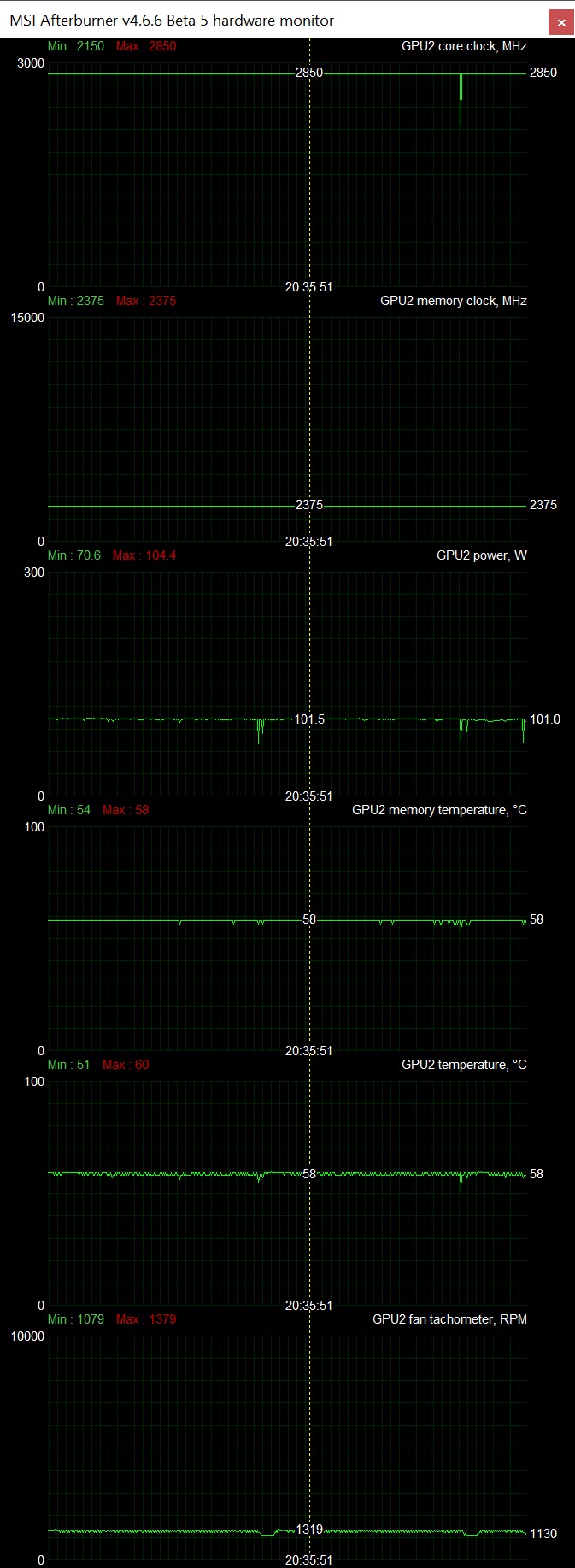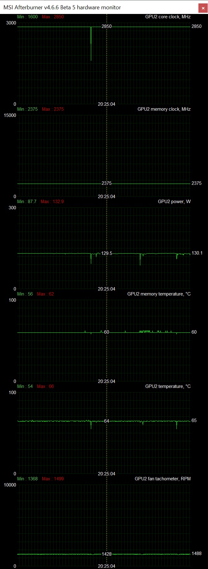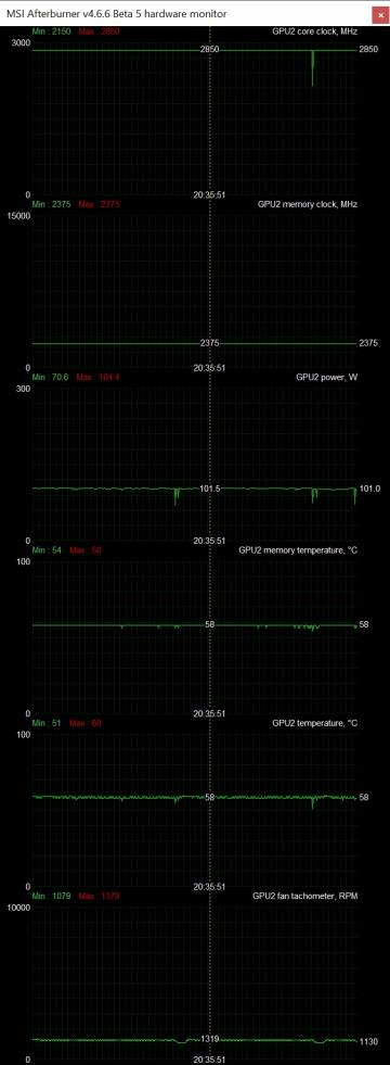 В том же Cyberpunk 2077, но уже в режиме 4K UHD, температура графического процессора поднялась до 65°C, а памяти – до 60°C. Вентиляторы раскручивались примерно до 1500 об/мин, однако субъективно уровень шума оставался таким же, как и в Full HD. Частота GPU при этом сохранилась на уровне 2850 МГц.