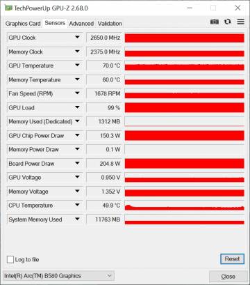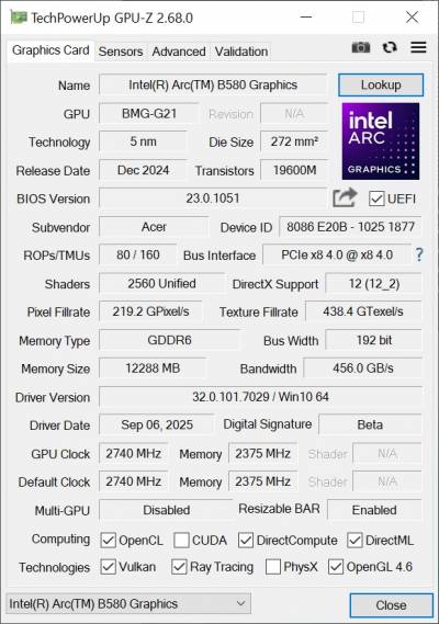 Поскольку перед нами фабрично разогнана версия видеокарты, 5-нм GPU Intel BMG-G21 (SRPMF) получил динамическую частоту 2740 МГц, что на 3% выше эталонного значения.