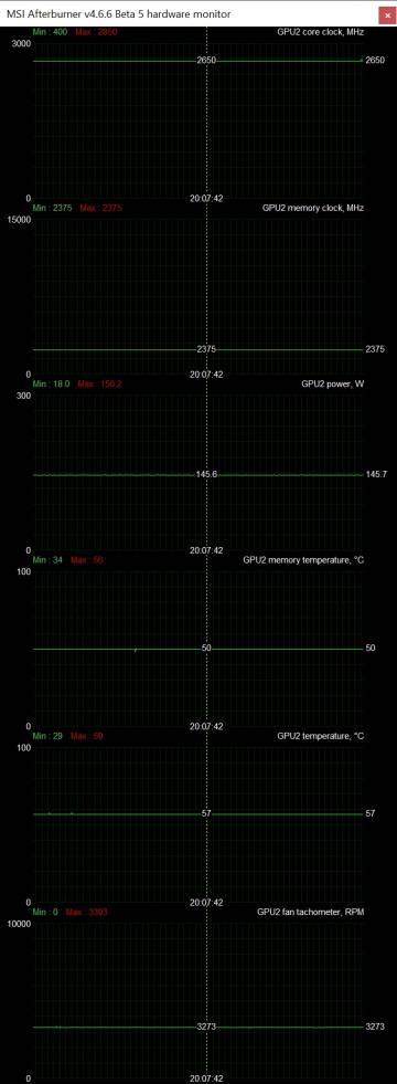 Принудительное повышение скорости вращения вентиляторов до 3200 об/мин позволило существенно снизить температуры: GPU охладел до 57°C, а чипы памяти - до 50°C. В то же время частота GPU осталась на уровне 2650 МГц. Единственным минусом такого режима стал избыточный шум, что делает его малопригодным для постоянного использования.