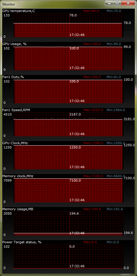 Во время работы видеокарты в разогнанном состоянии температура графического ядра не превышала 78 градусов.