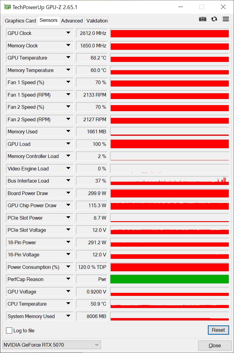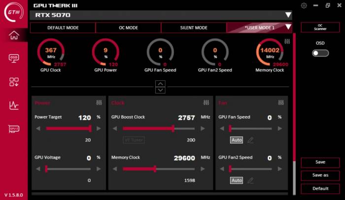 После разгона при максимальной нагрузке температура GPU повысилась всего на 3 °C — до 68 °C. Возможности системы охлаждения в этом случае были задействованы на 70% (2130 об/мин). Уровень шума не превышал средний и оставался комфортным для постоянного использования. При этом частота графического процессора достигала 2812 МГц, а напряжение на нём увеличилось с 0,885 до 0,920 В.