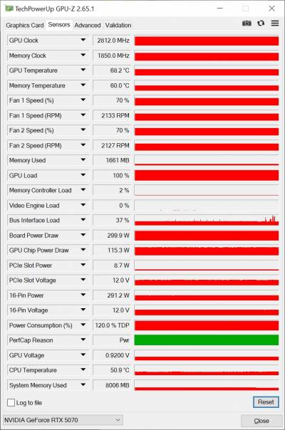 Энергопотребление тестового стенда с ASUS Prime GeForce RTX 5070 12GB GDDR7 OC Edition в случае разгона увеличивается с 365 до 415 Вт. При этом максимальное потребление самой видеокарты возрастает до 300 Вт.