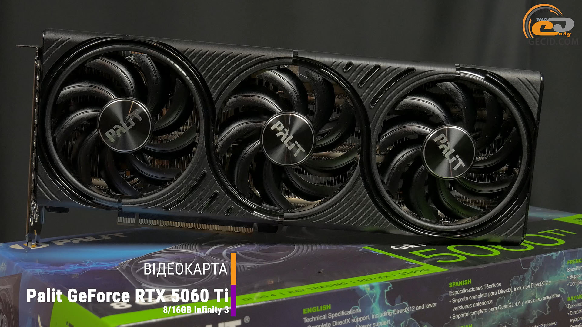 Изучать производительность мы будем на примере видеокарт Palit GeForce RTX 5060 Ti Infinity 3 в версиях на 8 и 16 ГБ, которые имеют значительно улучшенную 3-вентиляторную систему охлаждения в сочетании со строгим черным дизайном. При этом габариты ускорителей не так уж и велики: 292 мм в длину и 2 слота в толщину, что делает их совместимыми с компактными SFF сборками.