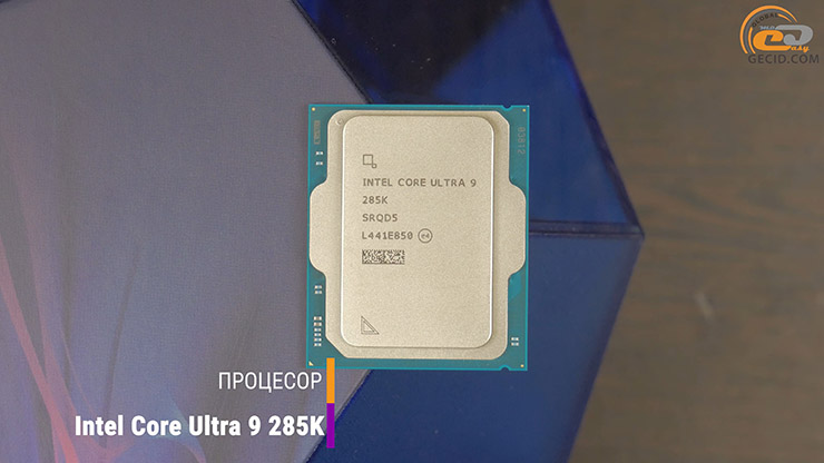 В качестве процессора выступает мощный и лучший представитель платформы LGA 1851 – Intel Core Ultra 9 285K. Который суммарно имеет 24 ядра во столько же потоков: рабочая частота производительных от 3,7 до 5,7 ГГц во время буста, а энергоэффективных 3,2 – 4,6. Поэтому он имеет базовый уровень энергопотребления 125 Вт с увеличением до 250 в турбо режиме.