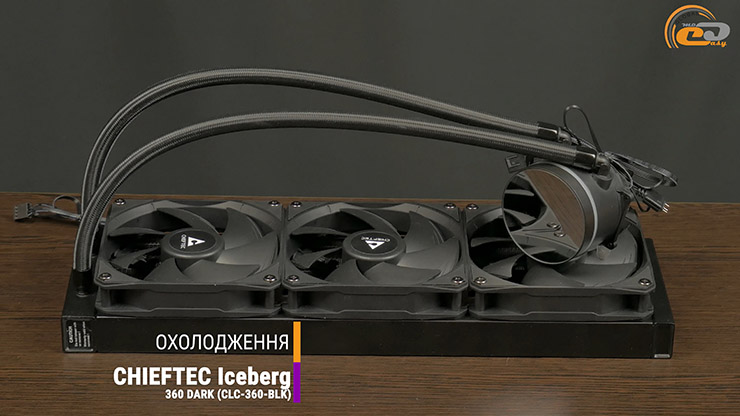 За стабильный температурный режим отвечает система жидкостного охлаждения CHIEFTEC Iceberg 360 DARK. Она состоит из помпы, работающей со скоростью от 1800 до 2700 об/мин, 360-миллимитрового радиатора и трех PWM-вентиляторов, которые могут развивать скорость до 2200 об/мин. А RGB подсветка делает эту СЖО более привлекательной в большинстве сборок.