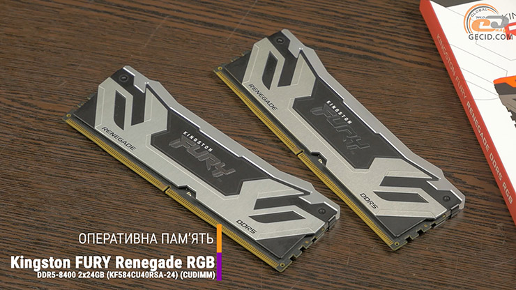 К этой платформе решили выбрать ОЗУ нового типа CUDIMM из двух модулей Kingston FURY Renegade DDR5 RGB по 24 ГБ с высокой скоростью работы в 8400 МТ/с. Последнее стало возможным благодаря дополнительному тактовому генератору. О том, как эта оперативная память работает, мы делали отдельный обзор.