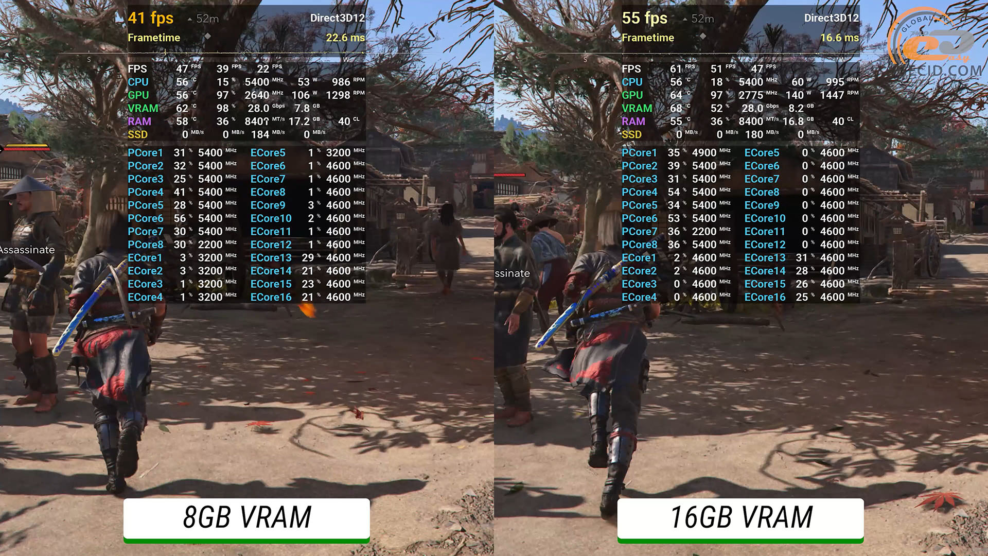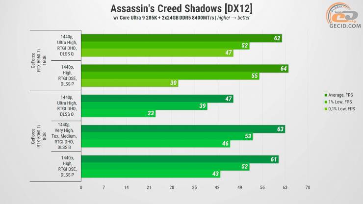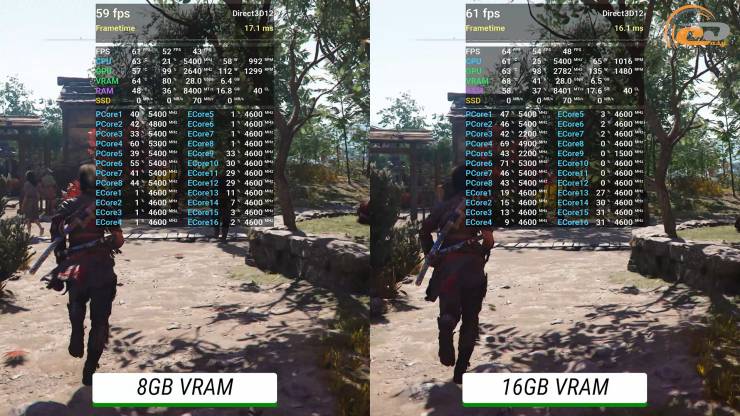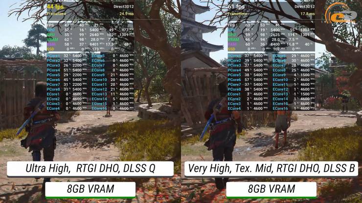 Первой на очереди будет Assasin Creed Shadows. Начнём с высоких настроек без трассировки лучей в открытом мире. На 16-гигабайтной версии имеется приятный геймплей около 60 кадров в секунду, но все равно приходится использовать DLSS в режиме качества. Что касается более слабой версии, то из-за проблемы с недостаточным объемом видеопамяти имеем худший результат примерно на 10-12 FPS и соответственно не очень плавную картинку.