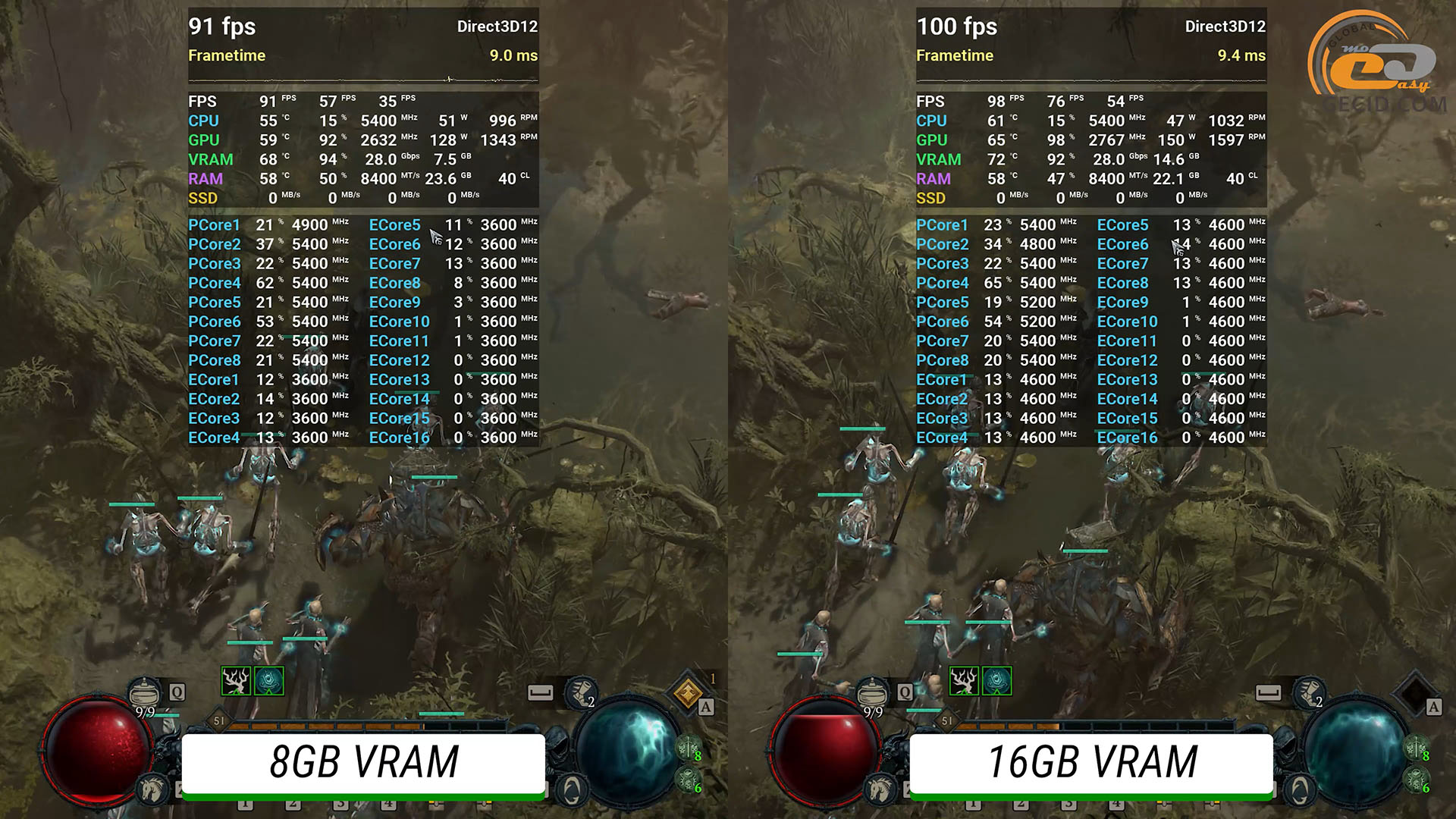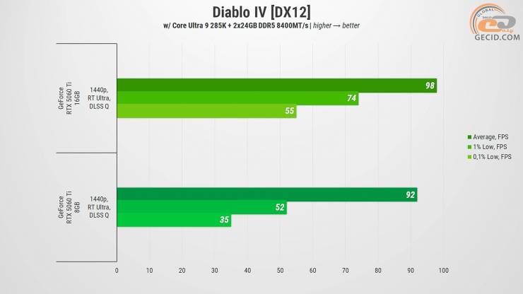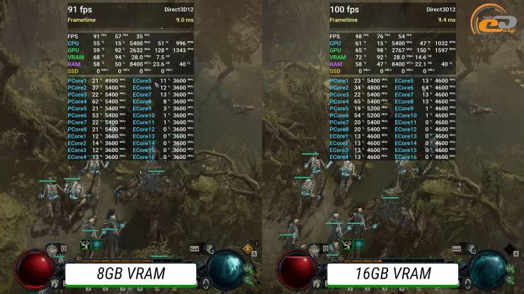 Пресет графики RT Ultra в Diablo IV видеокарта на 16 ГБ одолевает условно идеально, хотя и приходится сразу заручаться помощью апскейлера в качественном режиме. Такая манипуляция приведет к минимизации количества подергиваний во время большого количества эффектов на экране. Что касается более слабой модели, то снова сталкиваемся с недостаточным количеством видеопамяти, что приводит к достаточно заметным подтупам во время продвижения локацией. Но даже после загрузки окружения имеем более заметные подергивания и более неприятные просадки, чем на более мощной карточке.