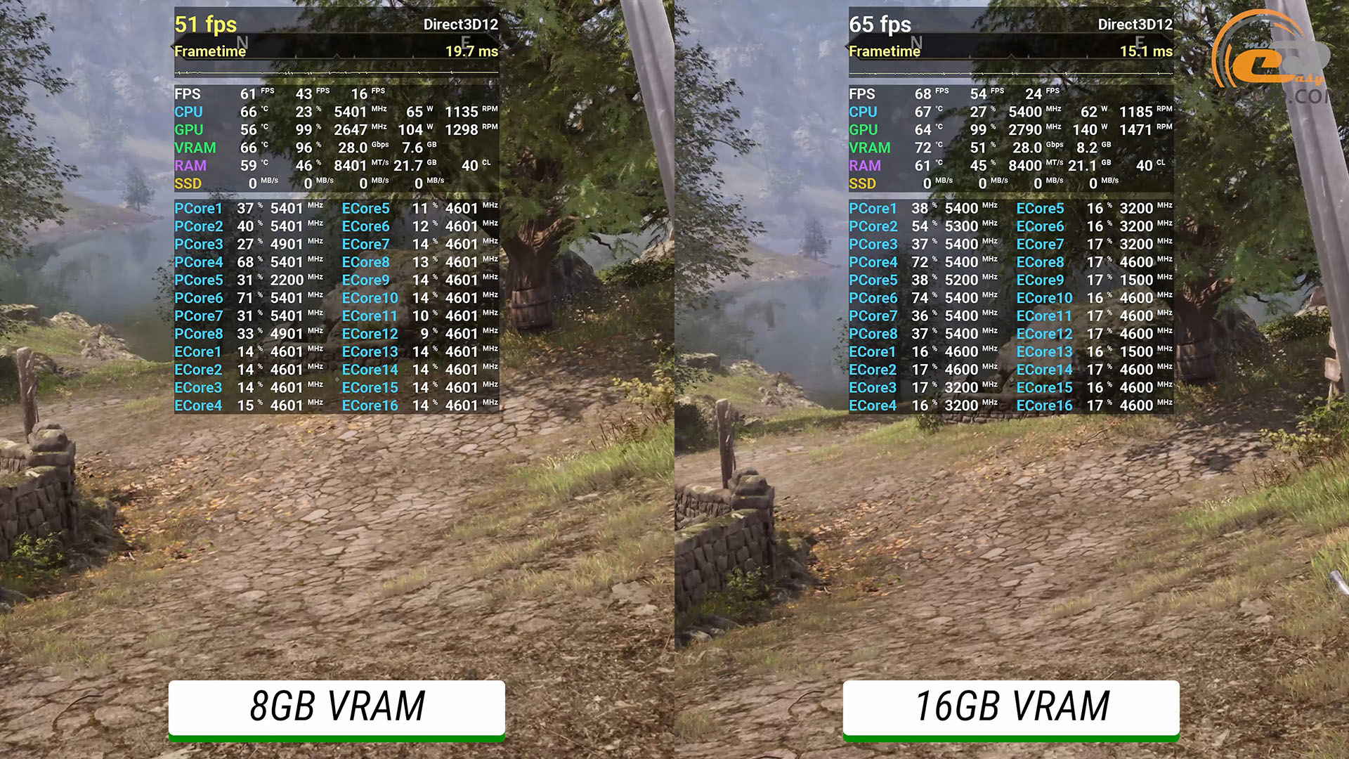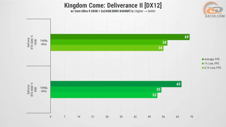 Производительности при ультранастройках в Kingdom Come: Deliverance 2 хватает обоим ускорителям для приятного прохождения игры. Хотя следует ожидать, что в более тяжелых локациях претензии к видеобуферу могут возрасти, что заставит играть с настройками графики или режимами апскейлинга для версии на 8 ГБ.