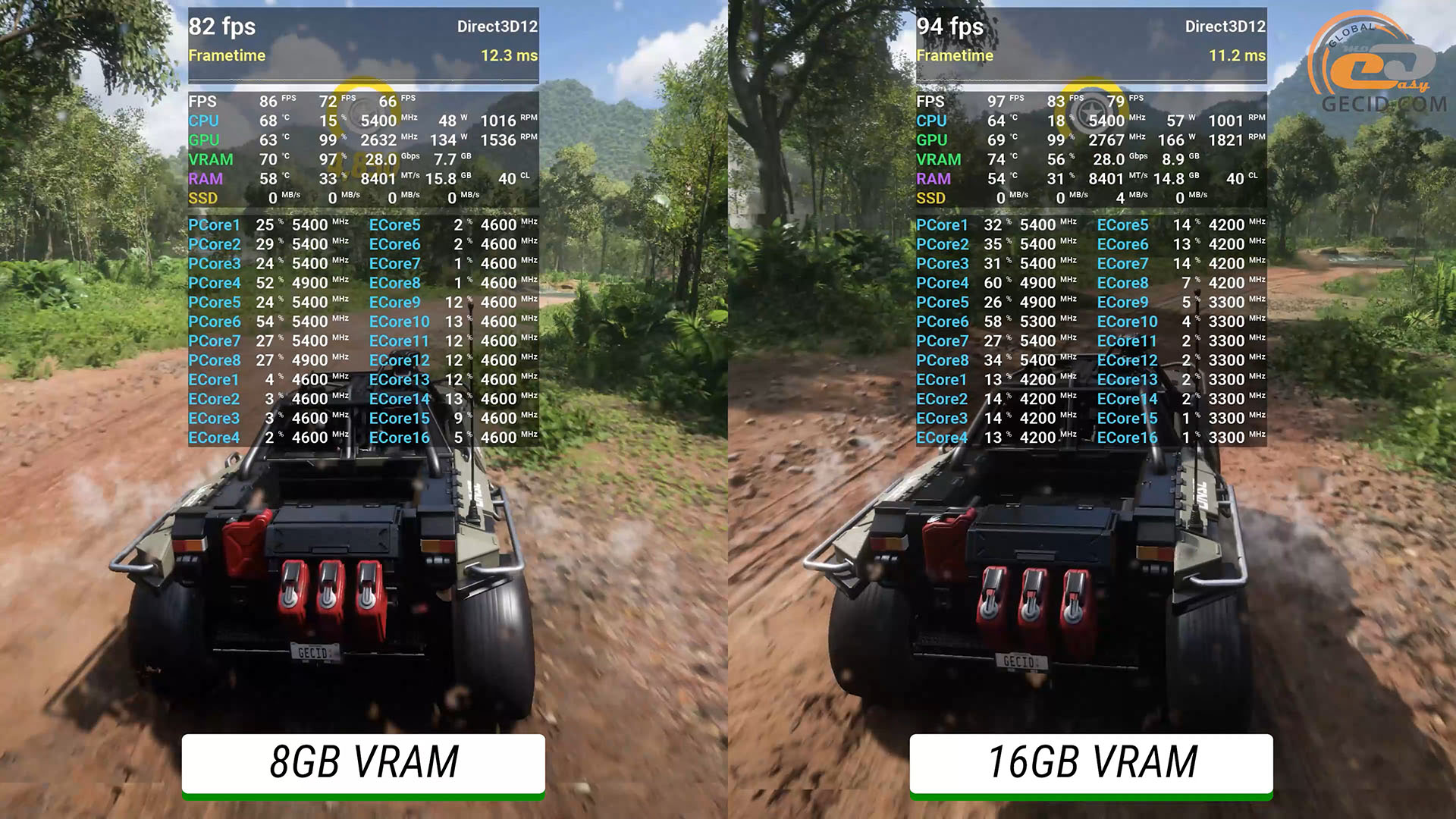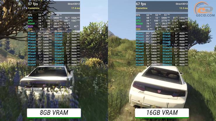 Для улучшенной версии GTA V даже на максимально доступном пресете графики с добавленным глобальным освещением достаточно и 8 ГБ видеопамяти. Обе видеокарты идеально справляются с просторами города, а более доступная версия сталкивается с небольшими трудностями только в густой растительности за пределами Лос-Сантоса.