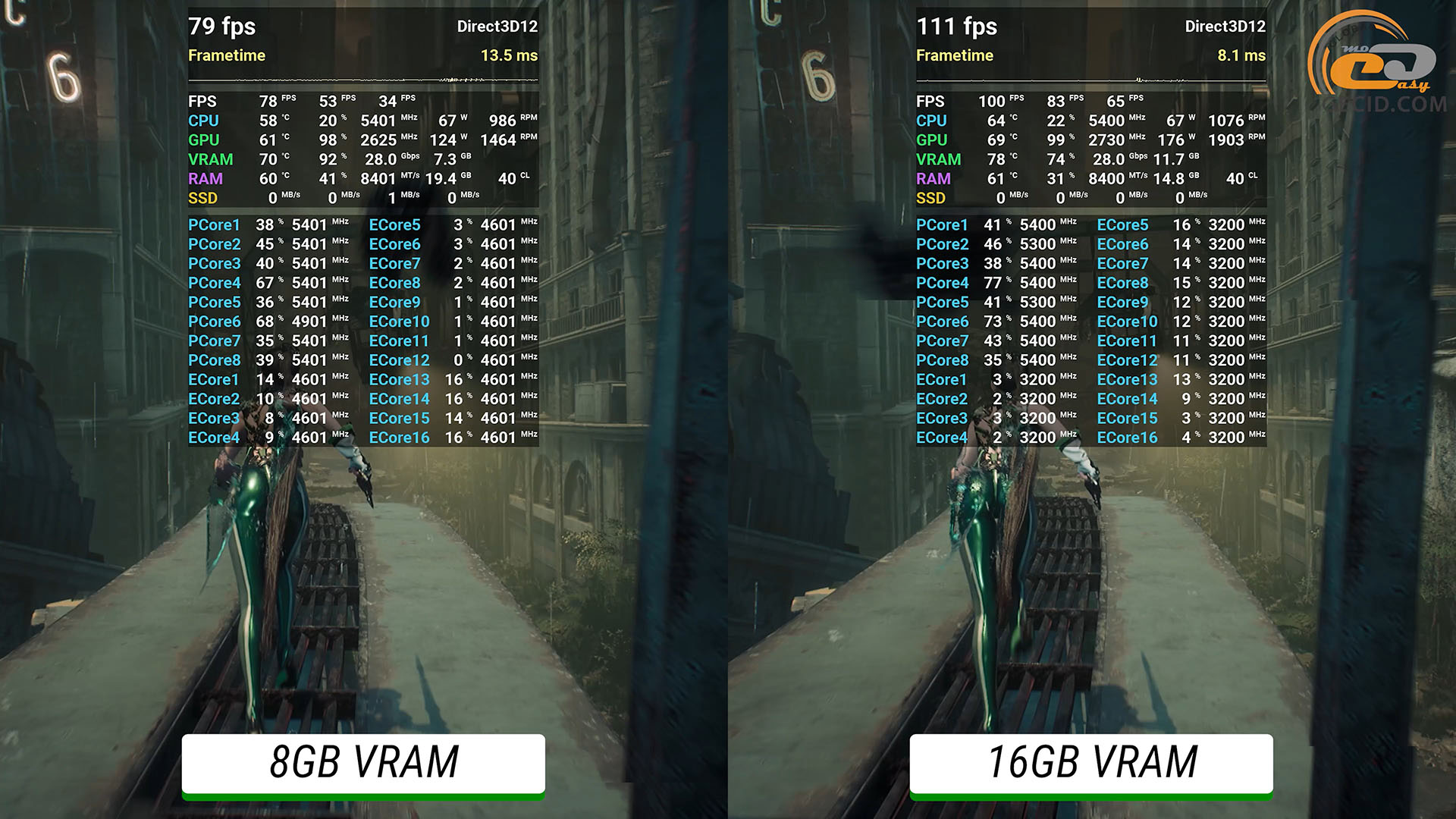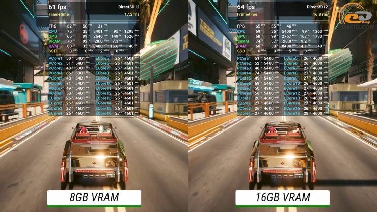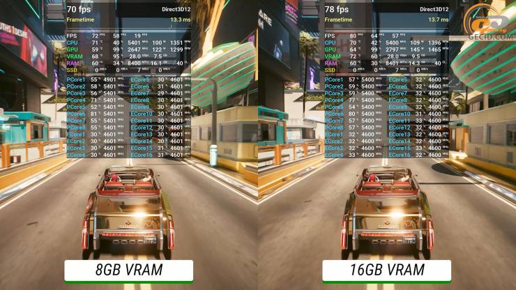Достаточно жадная к ресурсам игра Cyberpunk 2077 на пресете RT Ultra, который смягчен DLSS в сбалансированном режиме, остается довольной даже 8 гигабайтами видеопамяти, поэтому в обоих случаях геймплей приятный и вполне достаточный. Хотя более мощная видеокарта все же использует около 9 ГБ VRAM, из-за этого, вероятно, на ней есть и лучшие показатели длинных кадров. Особенно эта разница может проявиться со временем.