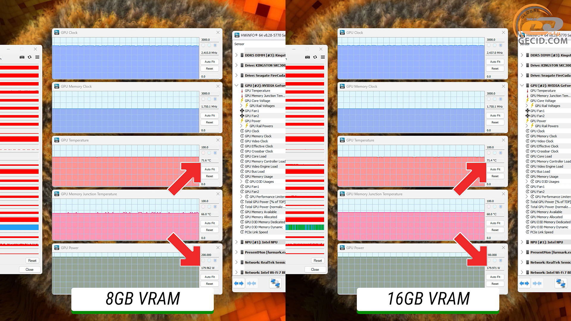 Напоследок расскажем об одной интересной особенности. Во время стрессового прогрева обе видеокарты имеют идентичные температурные показатели и уровень энергопотребления, но, на удивление, есть и отличия. 16-гигабайтная неожиданно держит несколько большую частоту на графическом процессоре – здесь разница всего 23 MГц в среднем.