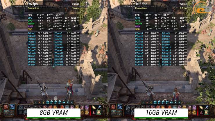 В третьем и самом сложном по нагрузке на систему акте игры Baldur`s Gate 3 на ультра настройках графики занято лишь около 6 ГБ видеопамяти. Поэтому в обоих случаях мы имеем идентичный и абсолютно достаточный результат, хотя на 16-гигабайтной карте экран обновлялся на несколько кадров чаще.