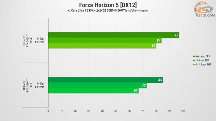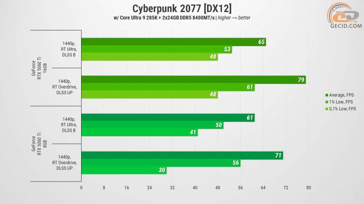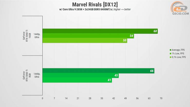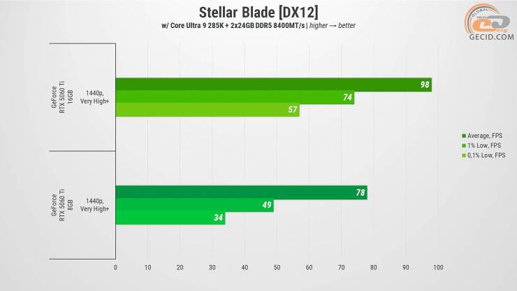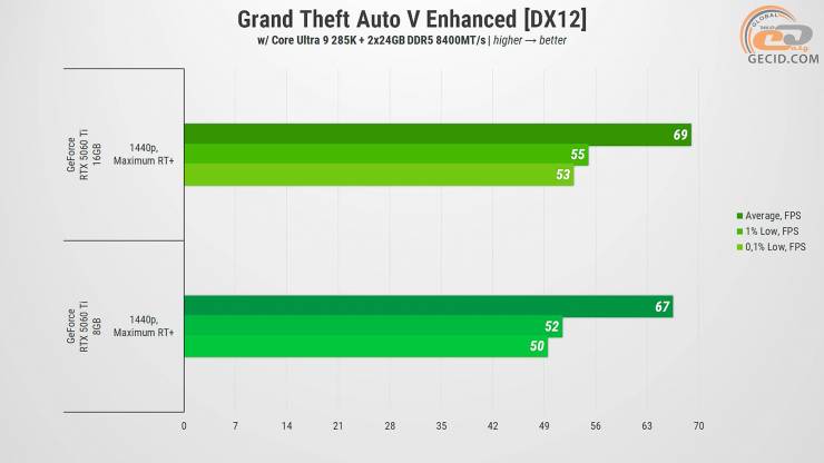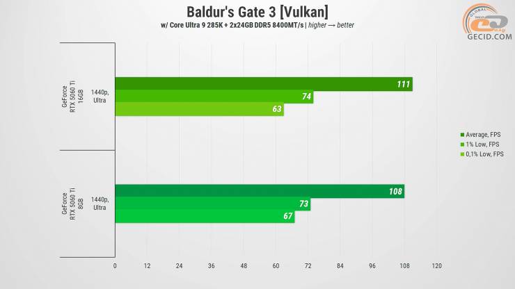 В результате GeForce RTX 5060 Ti в версиях на 8 и 16 ГБ оказались достаточно близкими во многих случаях, особенно если речь идет о более старых или хорошо оптимизированных проектах. Однако при детальном рассмотрении разница в объеме видеопамяти все же дает о себе знать – и чем дальше, тем больше. В играх с современной графикой, улучшенной трассировкой лучей, детализированными текстурами и открытыми мирами менее вооруженная версия уступает не только в общем FPS, но и в стабильности: присутствуют проседания, подфризы и иногда даже прямые предупреждения о недостатке VRAM.