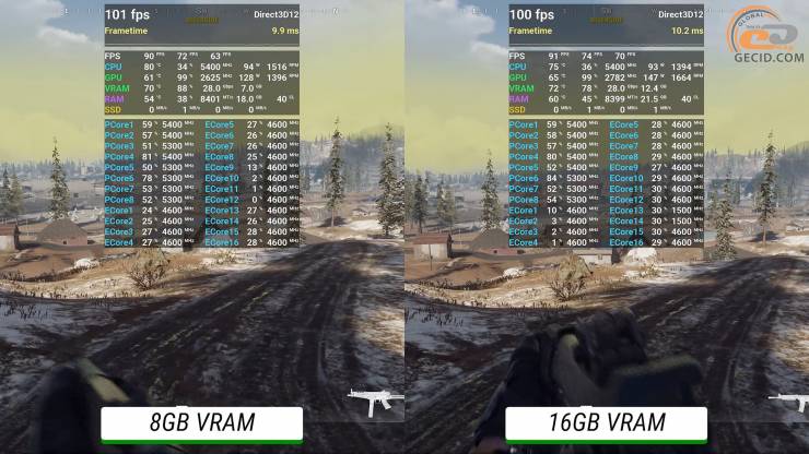 Похожая ситуация наблюдается и в Call of Duty: Warzone, где зимний лес на экстремальных настройках выглядит идеально и без каких-либо проблем в обоих случаях. Интересной особенностью становится встроенное в игру резервирование видеопамяти, через которое мы можем видеть разный объем занятого видеобуфера на двух видеокартах при одинаковых пресетах графики, а производительность примерно одинаковая. Поэтому реально нужное количество видеопамяти для таких настроек определить становится сложной задачей.