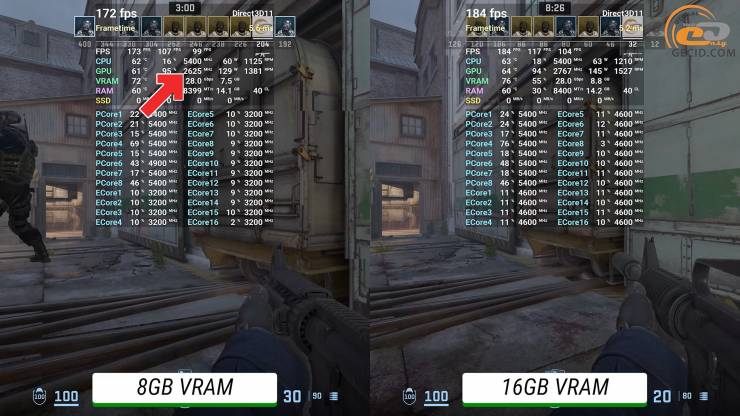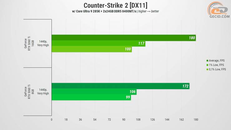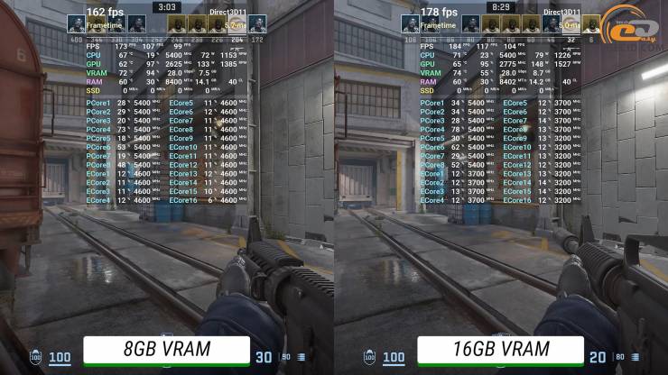 Высокие настройки на новой карте с поездами в Counter-Strike 2 идеально преодолеваются обоими ускорителями — менее 150 кадров в секунду не наблюдается. Но 16-гигабайтная версия иногда использует до 9,5 ГБ видеопамяти, чего оппонентка себе позволить не может. В любом случае большинство игроков в этой игре предпочитают низкие настройки, где разница в прихотях и производительности нивелируется.