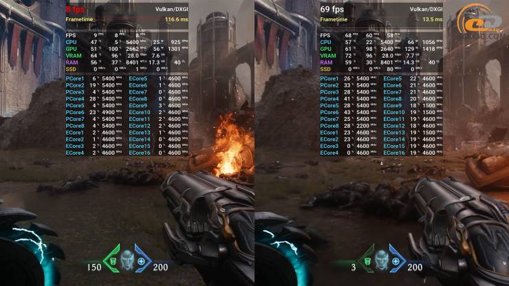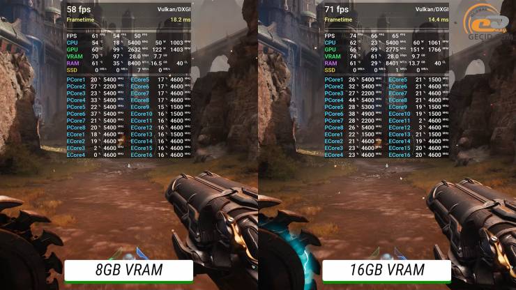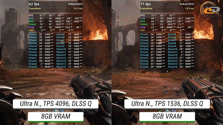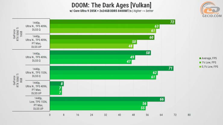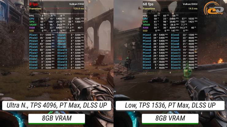 DOOM: The Dark Ages при 16 ГБ VRAM имеет довольно приятный геймплей с ультра кошмарными настройками, хотя все же приходится использовать функцию масштабирования в режиме качества. Версия на 8 ГБ тоже тянет такие настройки, но с заметно меньшей частотой кадров, хотя еще в играбельном диапазоне.