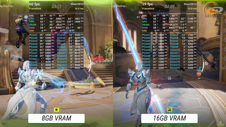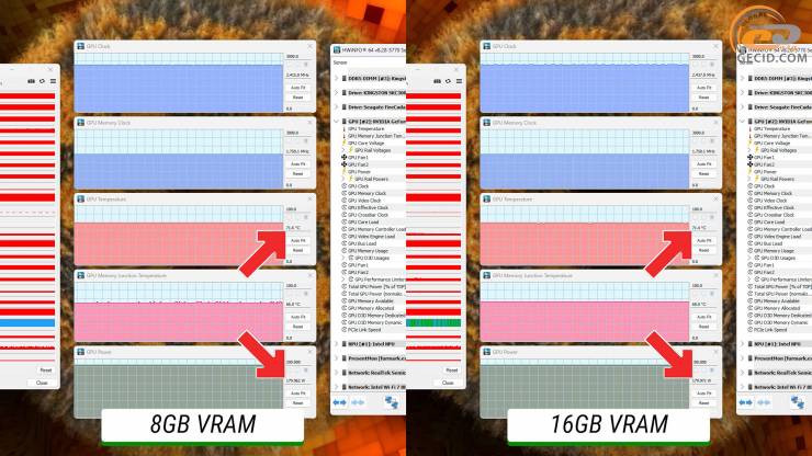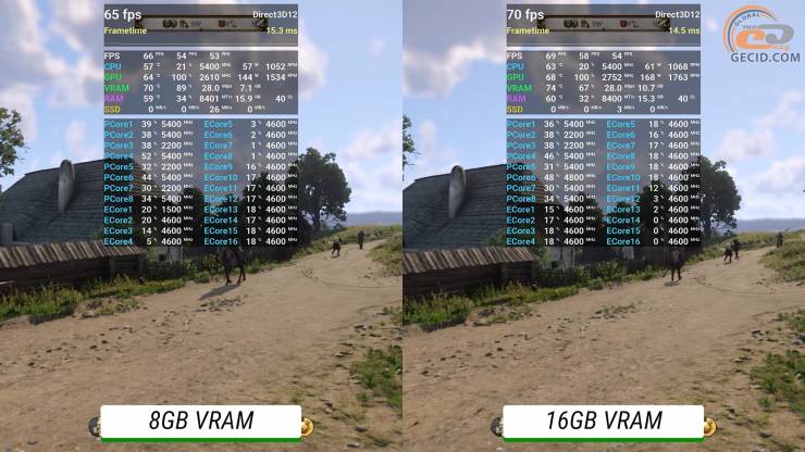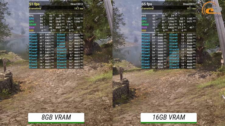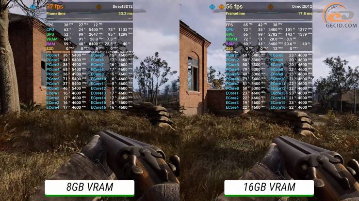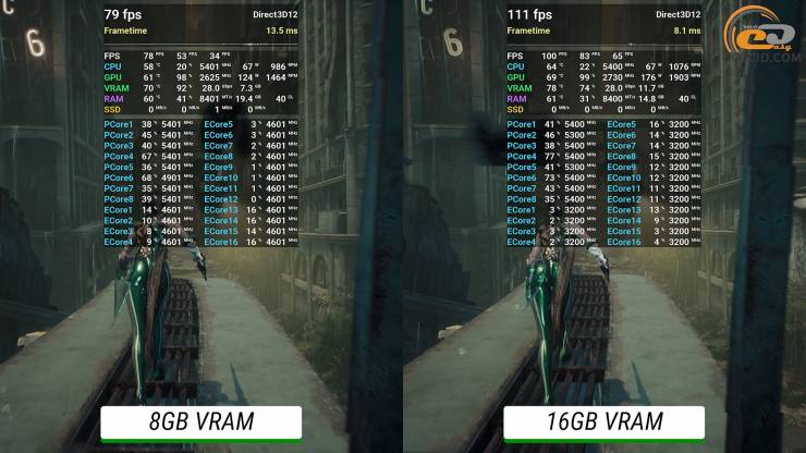 Но в играх, которые создают менее интенсивную нагрузку, и, вероятно, на рабочих задачах - разница уже достигает 150 МГц: 8-гигабайтная держит обычно частоту плюс-минус на уровне 2632 МГц, а 16 ГБ – 2775 МГц. Именно это и влияет на чистую производительность, которую мы и видели на практике.