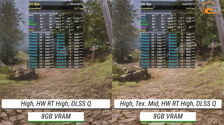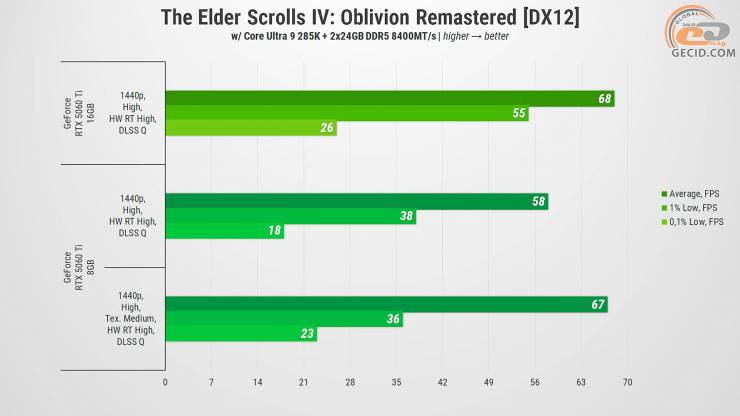 Последние обновления The Elder Scrolls IV: Oblivion Remastered немного улучшили всем немного надоевшую ситуацию с оптимизацией. На высоких настройках трассировки лучей более мощная версия видеокарты управляется условно хорошо, так как и частота обновления экрана приятна, и сильных подергиваний также нет, потому что избежать их помогает DLSS в режиме «Quality». А вот счетчик очень редких событий все же указывает на необходимость продолжать оптимизацию. Версия на 8 ГБ обеспечивает также неплохую производительность, но появляются более ощутимые подергивания плюс имеется некоторая потеря FPS.