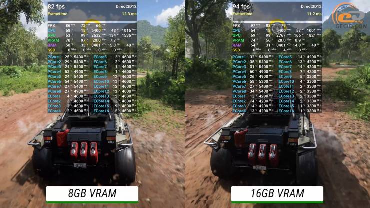 Один из самых популярных симуляторов гонок Forza Horizon 5 на экстремальном пресете со всеми возможными дополнительными улучшениями не становится помехой для обоих ускорителей. Хотя в 8-гигабайтной версии система все же предупреждает о возможной нехватке видеопамяти и ухудшении производительности, а показатель очень редких событий время от времени имеет более низкие значения по сравнению со средними, но FPS все равно остается в абсолютно комфортном диапазоне.