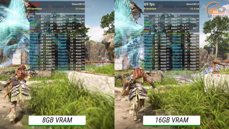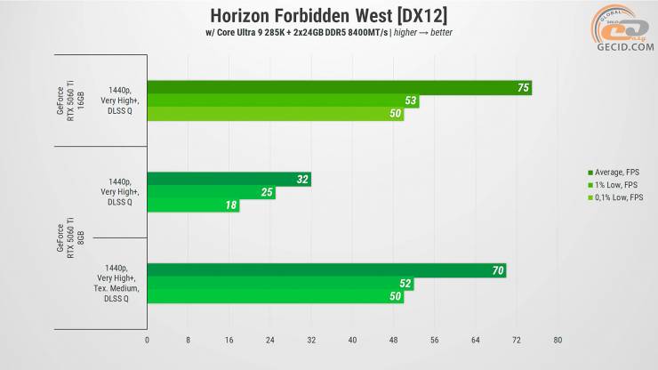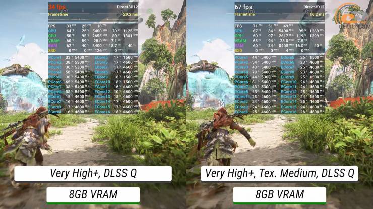 Очень высокие настройки и улучшенная до x16 анизотропная фильтрация текстур голодной к видеобуферу Horizon Forbidden West преодолевает только версия с 16 ГБ видеопамяти, и то с использованием DLSS в качественном режиме. А менее мощная версия упирается в максимально доступный объем VRAM и встречается с очень критической просадкой производительности, что создает почти невозможные условия для игры.