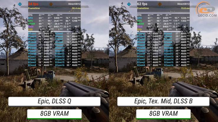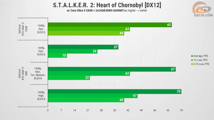 Получить достаточный уровень FPS на 5060 Ti в 8-гигабайтном исполнении можно за счет перехода к более агрессивному сбалансированному DLSS при ухудшении качества текстур до среднего уровня.