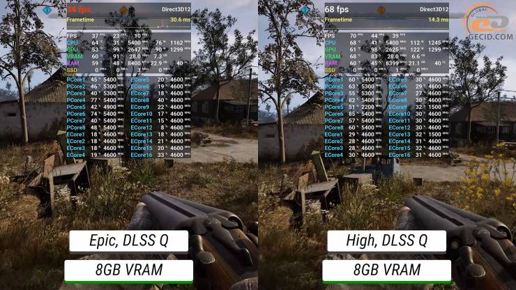После добавления трассировки лучей нужно снижать настройки графики к высоким и переводить DLSS в производительный режим. Но из-за этого игре теперь хватает 8-ми гигабайт видеопамяти, поэтому геймплей становится приятным на обоих ускорителях.