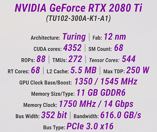 Давайте сначала немного напомним, что из себя представляет GeForce RTX 2080 Ti. Вышел данный ускоритель в сентябре 2018 года и стал представителем первой линейки видеокарт NVIDIA Turing с блоками аппаратного ускорения трассировки лучей.