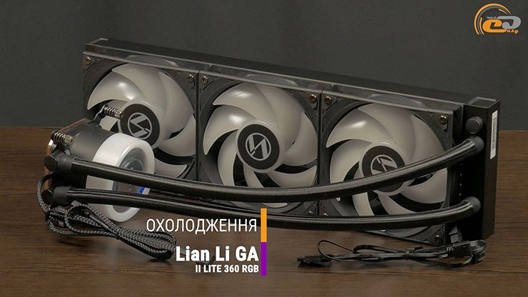 За охлаждение CPU отвечает жидкостная система Lian Li GA II LITE 360 RGB. Она оснащена помпой, работающей на скорости 3800 об/мин для эффективного отвода тепла. Плюс поворотный ARGB-блок с изображением логотипа придает стиля. На радиаторе установлены вентиляторы с 28-мм профилем и подсветкой, которые работают на скорости до 2500 об/мин, что гарантирует мощное охлаждение.