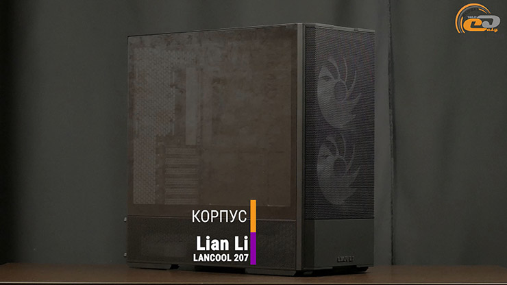 Все эти комплектующие разместились в относительно компактном корпусе Lian Li Lancool 207 со стеклянной панелью. Но главное, в комплекте он имеет два 140-мм вентилятора на передней поверхности и столько же 120-мм над блоком питания, что обеспечивает отличную вентиляцию, особенно в зоне размещения видеокарты. Интересной деталью является кронштейн для защиты видеокарты от провисания с вертикальной и горизонтальной регулировкой для поддержки различных ускорителей.