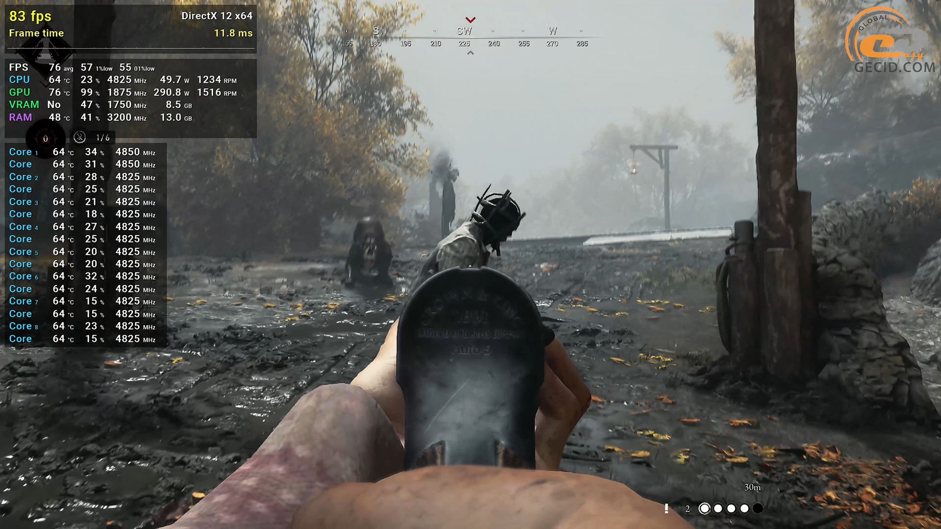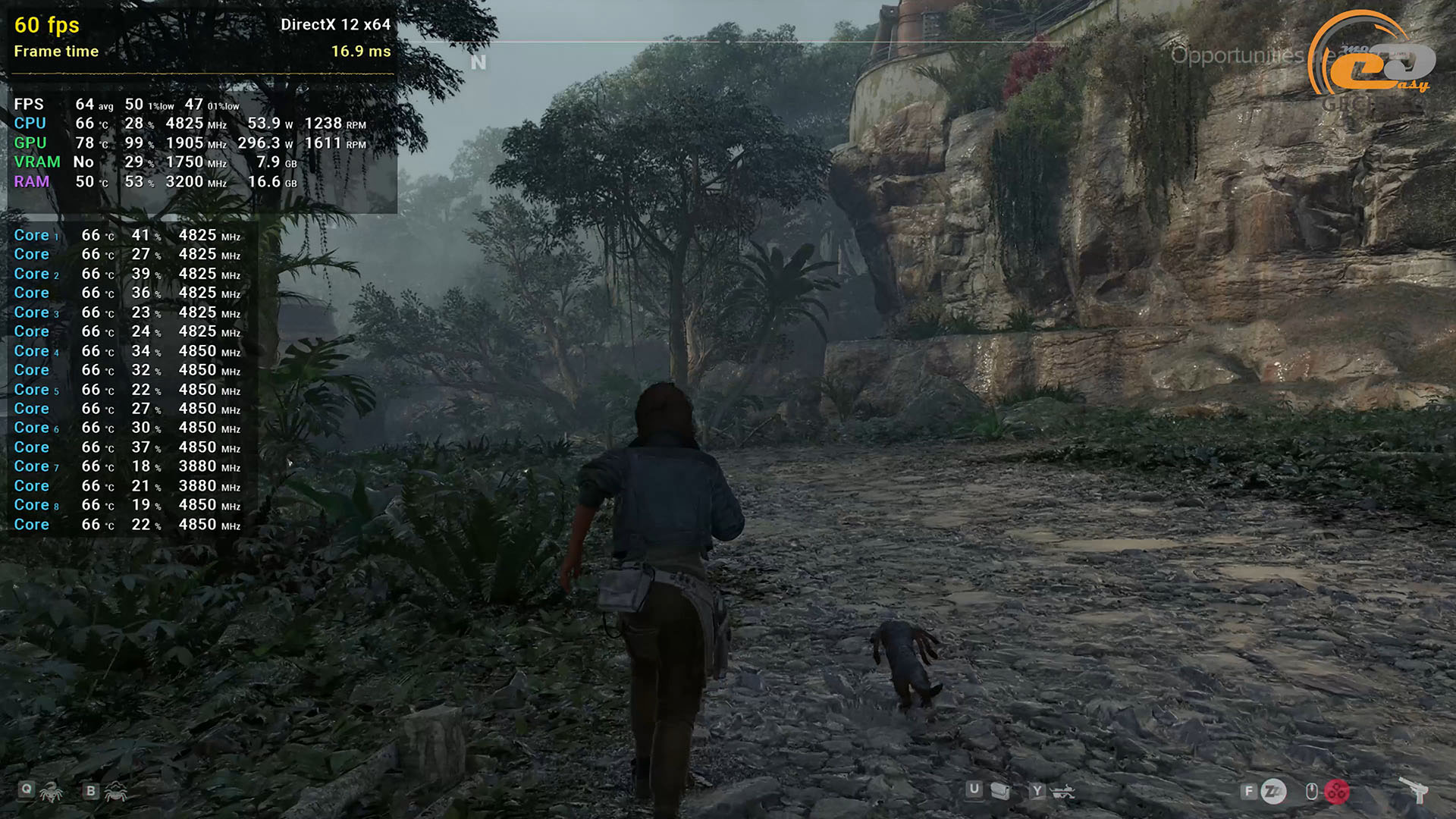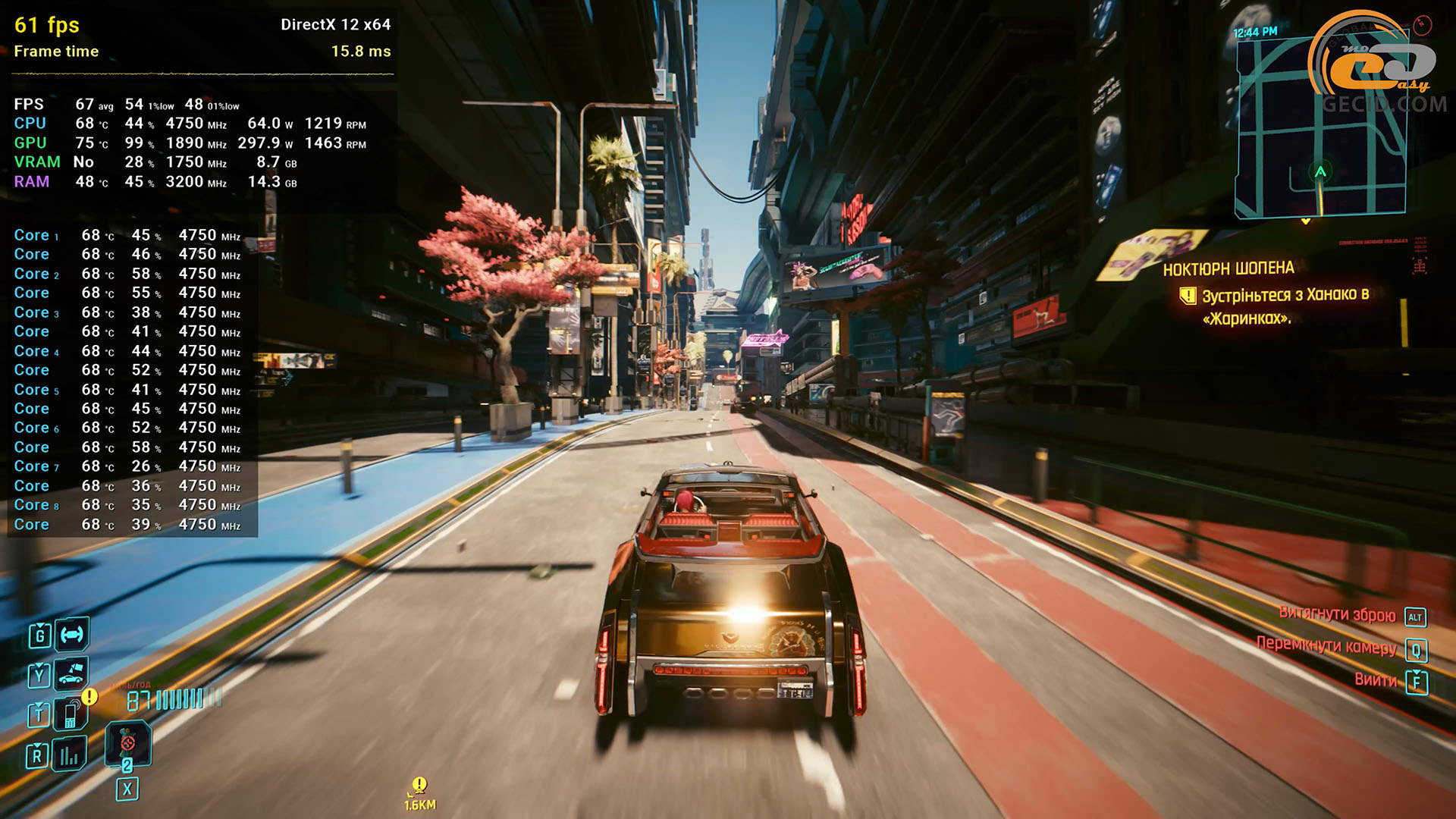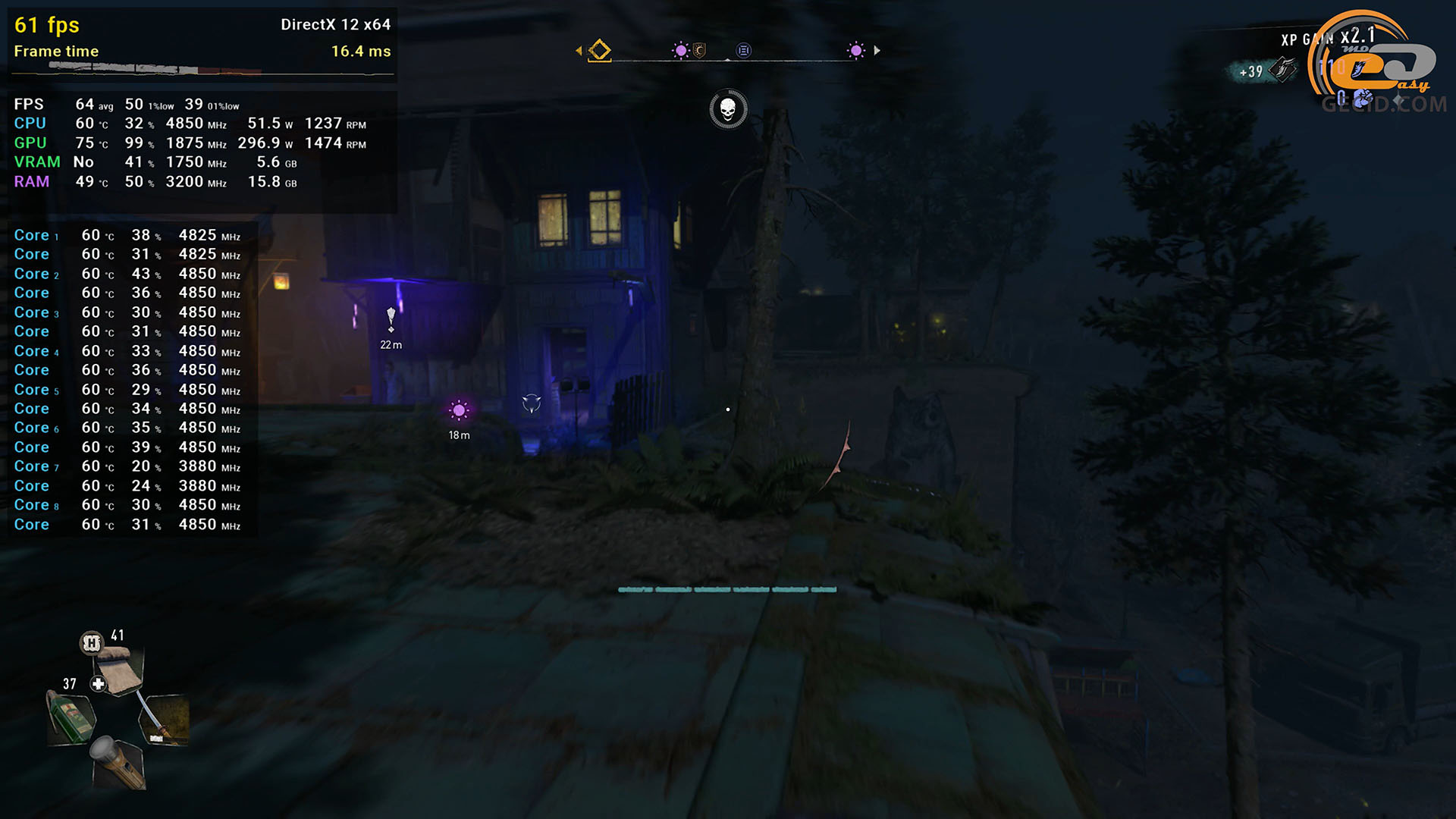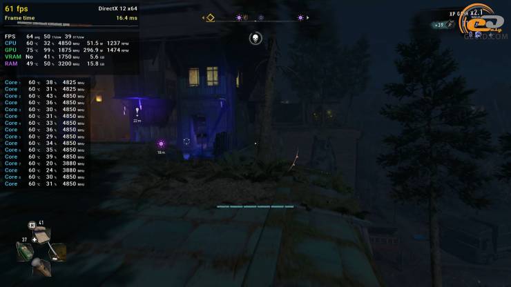 Паркуром в Dying Light 2 можно заниматься на пресете графики High Quality RT, хотя для комфорта все же нужен DLSS в качественном режиме. Как результат, имеем более 60 кадров в секунду даже во время пробежки по ночному городу, когда активность мутантов вокруг самая высокая. Следует отметить некоторые подергивания, на которые указывает показатель очень редких событий, но в реальности они почти не ощущаются, поэтому все ОК.