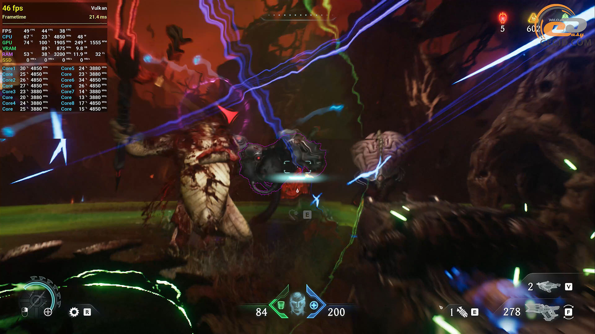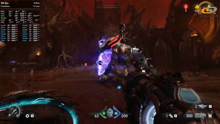 Если не гнаться за трассировкой лучей в DOOM: The Dark Ages, то видеокарта позволяет истреблять все на своем пути и на пресете графики Ultra Nightmare. Во время даже тяжелых сцен не прослеживается сильных проседаний или подергиваний, но прийти к все же 60-ти средним кадрам в секунду помогает DLSS в качественном режиме, при этом, избегая любого ощущения инпутлага.