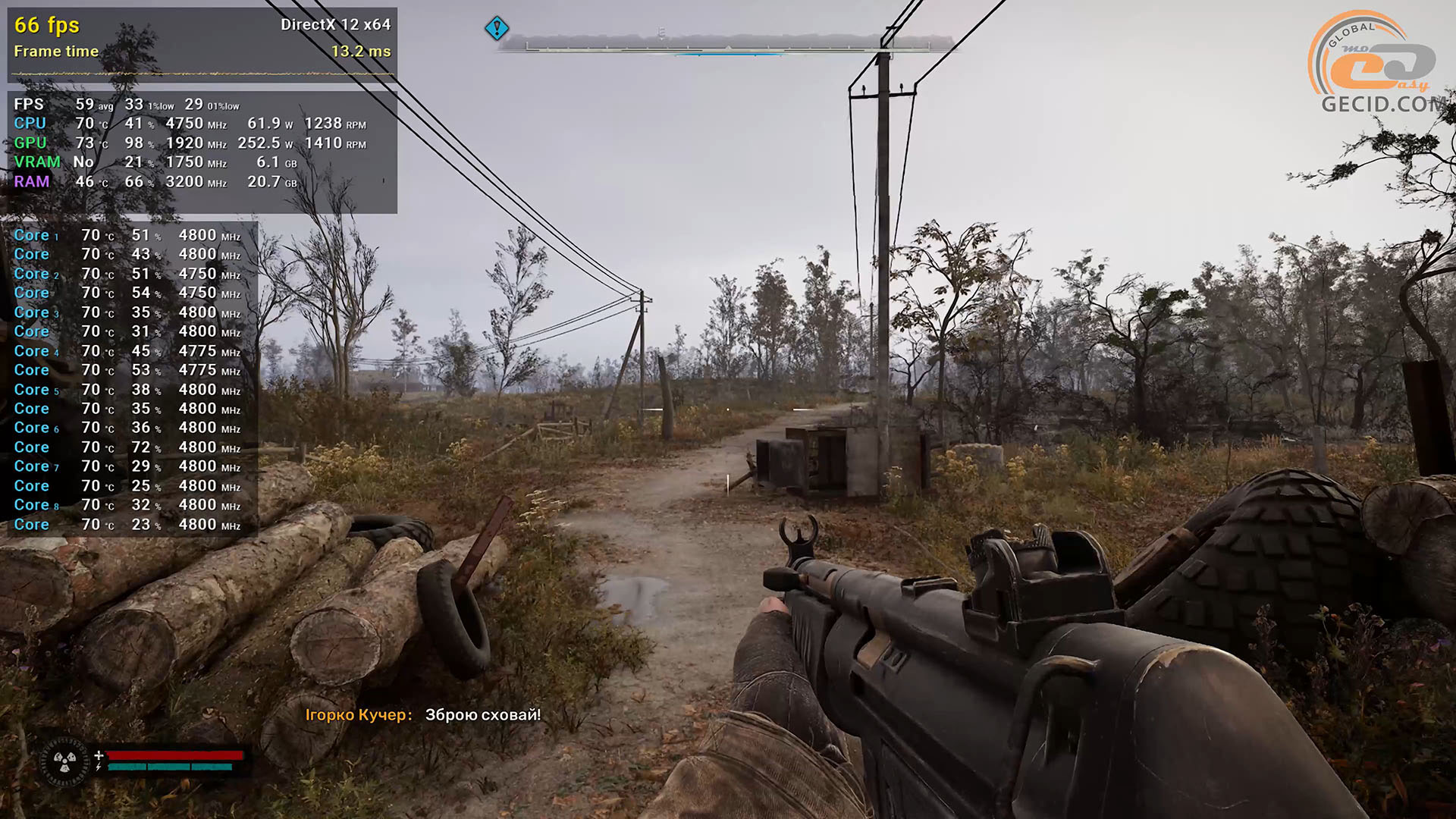 Тяжелую S.T.A.L.K.E.R. 2: Сердце Чернобыля всегда хочется запустить на как можно более высоких настройках, поэтому в нашем случае лучшим сочетанием становится микс высокого пресета графики и сбалансированного режима DLSS. К сожалению, иногда приходится мириться с заметными просадками FPS в локациях с большим количеством NPC. Однако в Full HD ситуация должна быть заметно лучше.