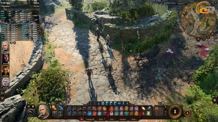 На RTX 2080 Ti в Baldur`s Gate 3 можно играть на ультра настройках графики и с дополнительно улучшенным DLAA сглаживанием. Даже во время передвижения по густо населенному городу никаких сюрпризов нас здесь не ждет — почти всегда счетчик FPS превышает планку в 100 кадров в секунду.