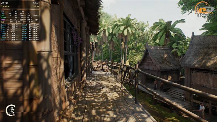 Также на «ультрах» проходит и Kingdom Come Deliverance II, хотя потребность в применении DLSS остается все еще обязательной. При таком раскладе только при передвижении по густым лесам или лагерям кочевников счетчик может показывать значения ниже 60 кадров в секунду.