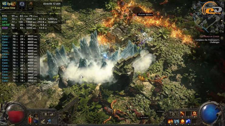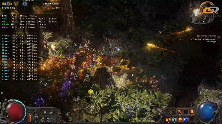 Path of Exile 2 даже на честных ультра настройках имеет достаточную частоту кадров, но во время большого количества эффектов в файтах видим проседание ниже порога в 60 FPS и довольно критические подергивания, о наличии которых также сообщают показатели редких и очень редких событий. Также нужно учитывать, что приближаясь к эндгейму количество монстров и эффектов станет еще большим, что приведет к более заметным проблемам с производительностью.