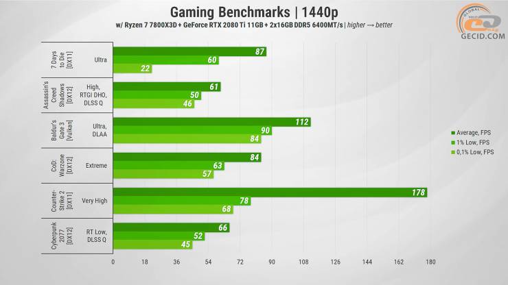 На момент своего релиза GeForce RTX 2080 Ti была флагманской видеокартой и настоящим прорывом в мир трассировки лучей. Прошло уже почти семь лет, а она все еще позволяет получить удовольствие от любой новой игры, по меньшей мере, в Full HD и Quad HD.