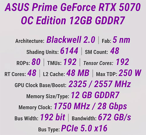 Графический чип модели насчитывает 6144 CUDA-ядра, 192 текстурных модуля, 80 блоков растеризации, 48 RT-ядер нового поколения и 192 тензорных ядра. Базовая частота GPU составляет 2325 МГц, а в режиме буста поднимается до 2557 МГц. Видеопамять – 12 ГБ GDDR7, со 192-битной шиной, обеспечивающей пропускную способность в 672 ГБ/с, а быстрые микросхемы дают хороший запас для будущих игр с тяжелыми текстурами.