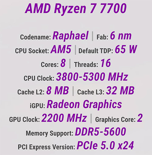 В качестве основного процессора здесь выбран достаточно популярный и многим знакомый по возможностям 8-ядерный 16-поточный AMD Ryzen 7 7700 с архитектурой Zen 4.
