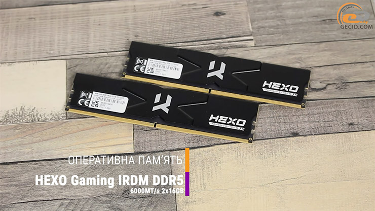 ОЗУ здесь также брендированное — 32 ГБ DDR5-6000 HEXO Gaming IRDM DDR5 6000MT/s 2x16GB (IRK-HX60D564L30S/32GDC), набранное комплектом из двух модулей. Каждая планка получила фирменный минималистичный радиатор с логотипом HEXO, а по своему происхождению легко догадаться, на чьих решениях она базируется проскакивает почерк Goodram.