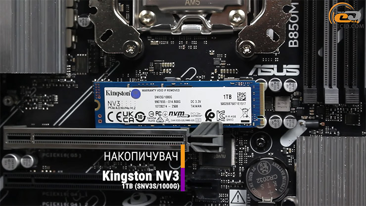 За хранение данных отвечает «народный» Kingston NV3 объемом 1 ТВ. Это NVMe SSD с интерфейсом PCI-E 4.0 x4, который отлично подходит для установки ОС, игр и повседневных приложений. Обеспечивает скорость до 6000 МБ/с на чтение и до 4000 МБ/с на запись. Модель относится к доступному сегменту, но при этом имеет хорошую выносливость – до 320 TBW.