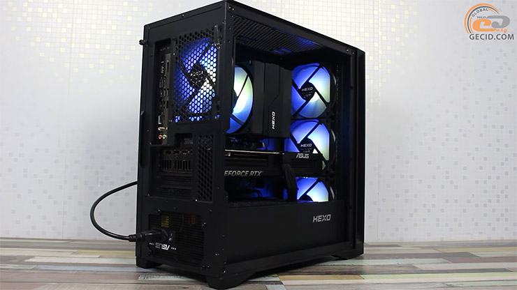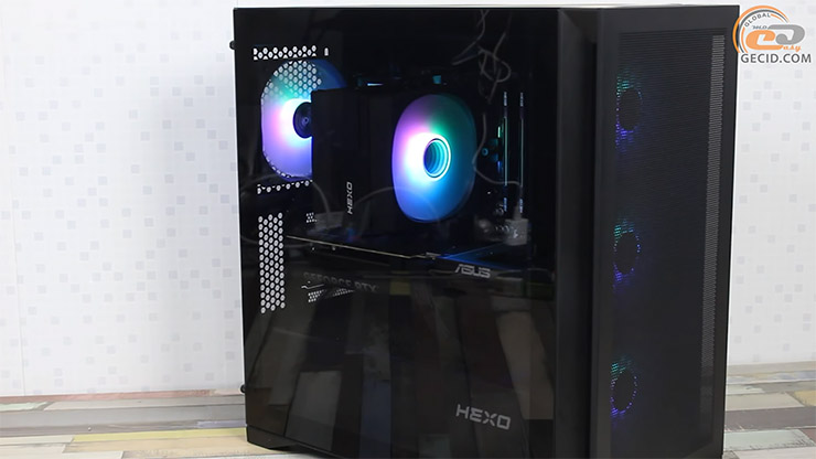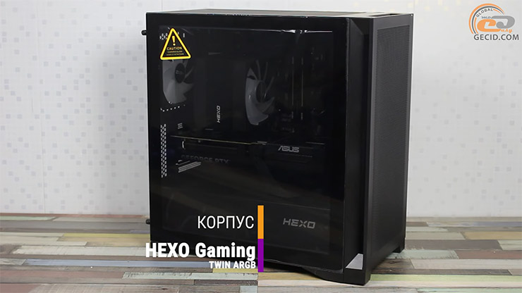 Все комплектующие находятся в корпусе HEXO Gaming TWIN ARGB. Это стильный небольшой Mid Tower со стеклянной боковой панелью в двухкамерном исполнении, то есть с коробом для блока питания снизу, что улучшает охлаждение компонентов.