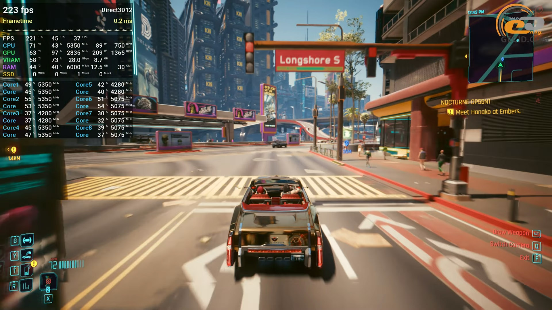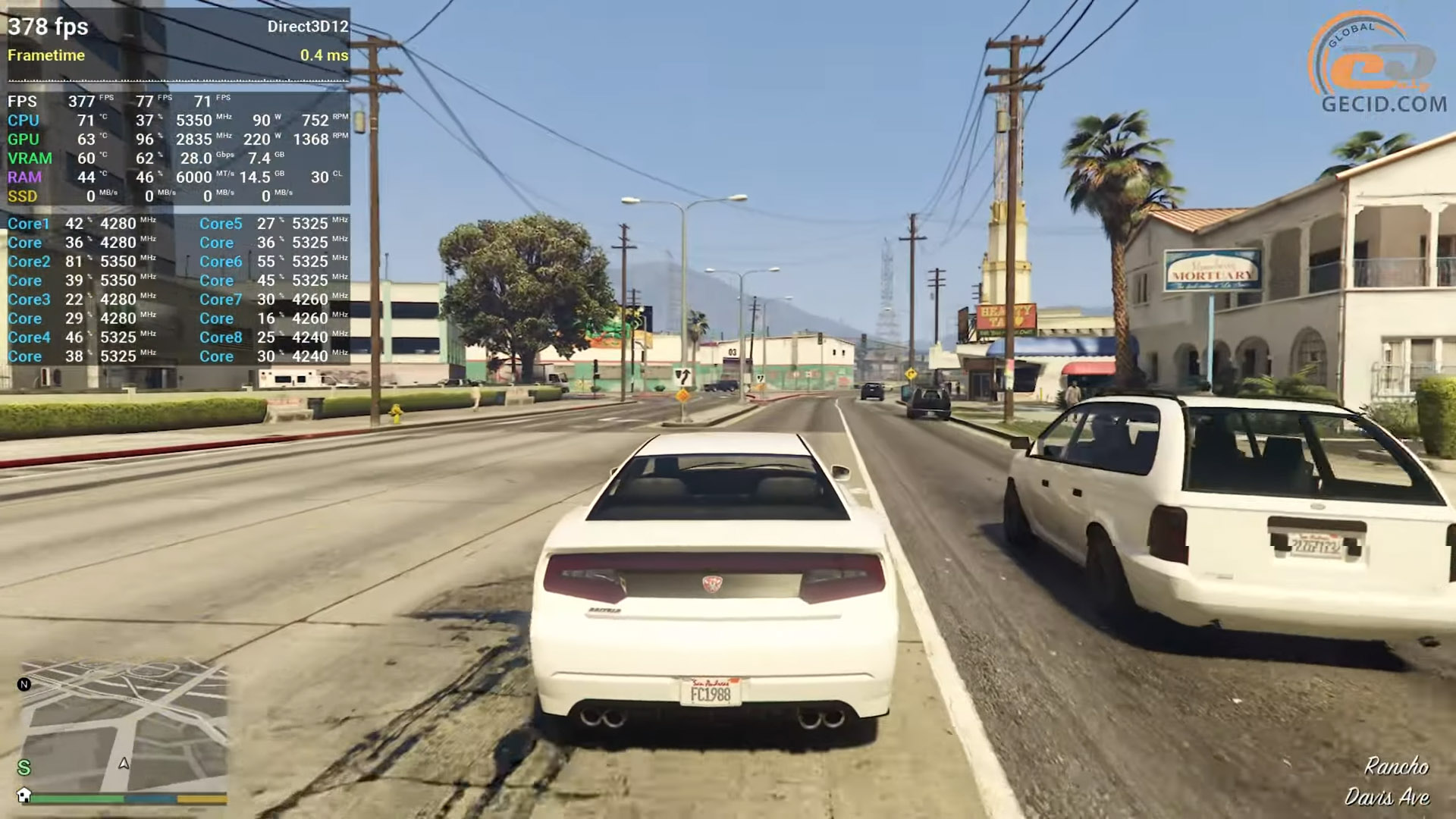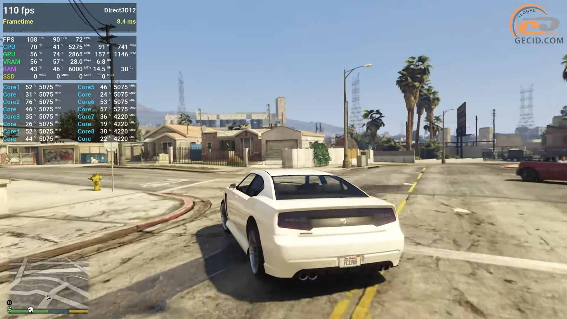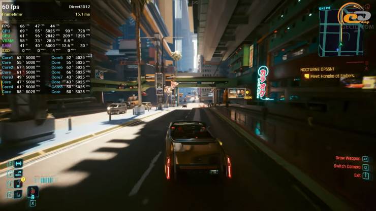 Также стоит посмотреть на производительность в улучшенной версии пятой GTA. Здесь все работает отлично. Производительность упирается разве что в лимиты энергопотребления процессора, а видеокарта работает всего на 70 процентов своих возможностей, поэтому частота кадров на открытых зеленых локациях практически не отличается от городских сцен — иногда даже становится выше. Однако в целом геймплей максимально плавный и без просадок.