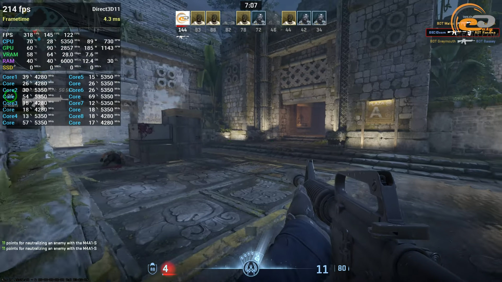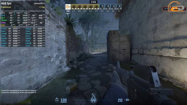 Побегать на ночном Ancient в Counter-Strike 2 можно без проблем даже на очень высоких настройках. При таком, довольно нетипичном для большинства игроках пресете, система выдает более 300 FPS в среднем. Однако стоит обратить внимание и на показатель очень редких событий: он заметно ниже среднего — примерно втрое, поэтому иногда могут проскакивать легкие подергивания. Они не критичные, но полностью ровным геймплей из-за их наличия назвать нельзя.